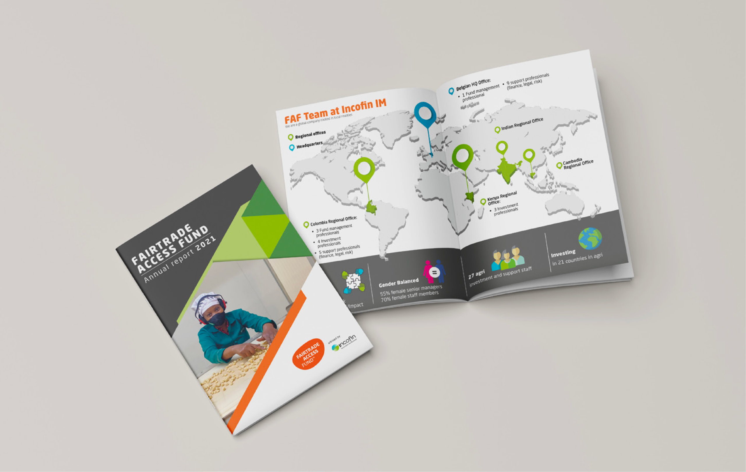 Diseño y diagramación del informe anual 2021 del Fairtrade Access Fund, administrado por Incofin. Un reporte corporativo internacional que comunica el impacto del fondo en 21 países y refleja la solidez de la organización ante sus inversionistas y aliados.
